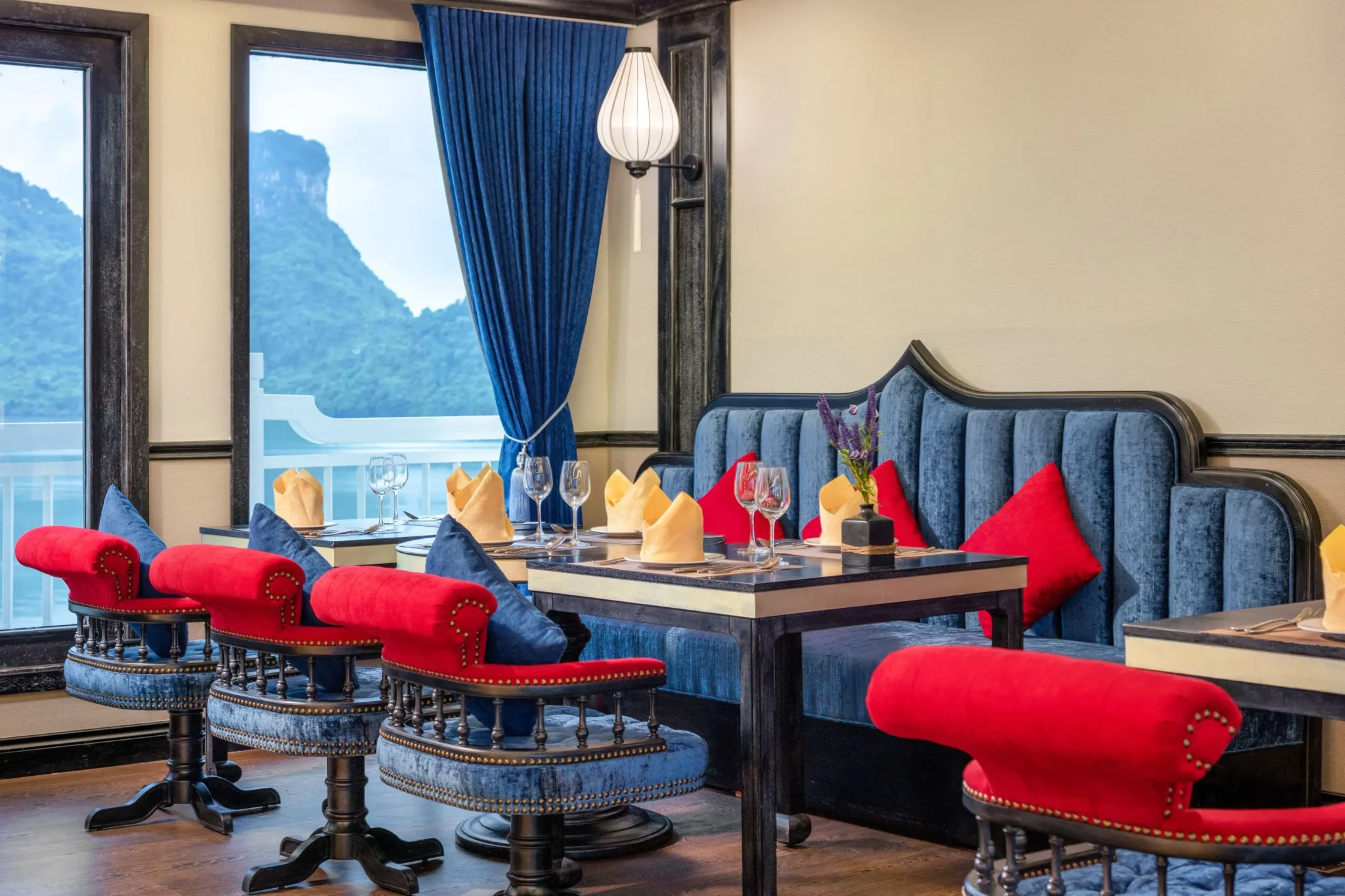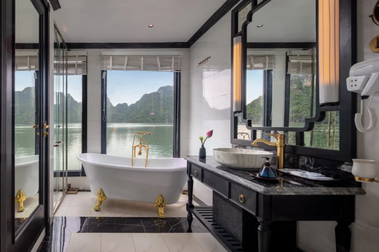 During the first day, guests can enjoy a leisurely lunch while passing iconic islets and scenic formations before arriving at the tranquil Tra Bau area. Here, kayaking and swimming offer an up-close experience of the bay’s natural beauty, with calm waters and dramatic cliffs creating a serene setting. As evening approaches, the sundeck becomes the heart of onboard life, with a relaxing sunset party followed by a cooking class introducing traditional Vietnamese cuisine. A romantic dinner under the stars completes the day, accompanied by optional evening activities such as squid fishing or enjoying drinks at the bar.